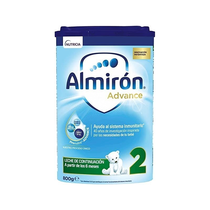 Complemento alimenticio de continuación para lactantes a partir de 6 meses. INGREDIENTES Lactosa (procedente de la leche), aceite vegetales (palma, coco, canola, girasol, girasol alto oleico), leche desnatada, suero desmineralizado (procedente de la leche), galacto-oligosacaridos (procedentes de la leche), suero concentrado (procedente de la leche), fructooligosacáridos, fosfato de calcio, aceite de pescado, proteina de suero (procedente de la leche), cloruro de potasio, citrato de potasio, hidrogenofosfato de magnesio, aceite de Mortierella Alpina, carbonato de calcio. Cloruro de colina, citrato de sodio, ácido L-ascorbico, emulsificante (lecitina de soja), cloruro de sodio, taurina, mositol, cloruro de magnesio, sulfato de hierro, L-Tnptófano. L-ascorbato de sodio, L-Carnitina, sulfato de zinc, citidina 5'-monofosfato, sal sódica de uridina 5'-monofosfato, antioxidante (palmitato de ascorbilo), adenosina 5'-monofosfato, sal sódica de inosina 5'-monofosfato,nicotinamida. D pantotenato de calcio, acetato de DL-a-tocoferol, sal sódica de guano sina 5'-monofosfato, sulfato de cobre. DL-a-tocoferol, palmitato de retinol, riboflavina, hidrocioruro de tiamina, hidrocioruro de piricioxina, yoduro de potasio, ácido fólico, sulfato de manganeso, fitomenadiona, selenito de sodio, colecalciferol, D-Biotina, cianocobalamina. VITAMINAS, MINERALES Y AMINOACIDOS GOS: 3.3 g FOS: 0,55 g Vitamina A: 413 mcg Vitamina D: 12 mcg Vitamina E: 5,4 mg Vitamina K: 41 mcg Vitamina C: 62 mg Vitamina B1: 0,35 mg Vitamina B2: 0,97 mg Vitamina B3: 3,2 mg Vitamina B6: 0.3 mg Folato: 92 mcg Vitamina B12: 1,2 mcg Biotina: 12 mcg Vitamina B5: 3.4 mg Sodio: 159 mg Potasio: 539 mg Cloro: 373 mg calcio: 503 mg Fosforo: 347 mg Magnesio: 49 mg Hierro: 7 mg Zinc: 3,5 mg, cobre: 0,37 mg Manganeso: 0,04 mg Fluor: 0,04 mg Selenio: 21 mcg Yodo: 90 mcg L-carnitina: 14 mg Colina: 104 mg Taurina: 35 mg MODO DE EMPLEO Lavarse bien las manos con agua y jabon siempre que se manipule un biberón y esterilizar todos los utensilios antes de utilizarlos por primera vez. Siguiendo la tabla de dosificación, verter la cantidad de agua en el biberón. Es aconsejable utilizar agua mineral natural apta para la preparación de alimentos infantiles y que esté templada para una mejor disolución del polvo. En caso de utilizar agua del grifo, hervir la cantidad suficiente entre 1 y 2 minutos y dejarla enfriar hasta 40ºC. Dosificar exactamente cada toma utilizando unicamente el cacito que se encuentra en el interior y usando el enrasador del envase. Añadir al biberón el numero correspondiente de medidas rasas y sin comprimir, siguiendo la tabla de dosificación. Tapar el biberón y agitarlo inmediatamente vigorosamente de manera vertical durante 10 segundos, hasta la completa disolución del polvo. Probar la temperatura del alimento antes de dárselo al bebé. Una vez finalizada la toma, tirar el alimento restante y limpiar todos los utensilios utilizados. PRECAUCIONES Y ADVERTENCIAS Utiliza siempre la leche bien preparada. Consumir antes de 2 horas y no conservar los restos de biberón para posteriores tomas. La correcta preparación y dosicicación del producto es esencial para la salud del lactante y podrían existir riesgos en caso de preparación inadecuada. CONSERVACIÓN Y CADUCIDAD Una vez abierto el envase consumir antes de 4 semanas. Conservar en lugar fresco y seco. No meter en la nevera. USO EN PACIENTES CON INTOLERANCIA ALIMENTARIA Este producto lo puede tomar una persona celíaca y alérgica/intolerante al huevo. Este producto no está recomendado para una persona alérgica a la proteína de leche o intolerante a lactosa. Contiene una fuente de soja. Contiene una fuente de fenilalanina. Contiene una fuente de pescado.
